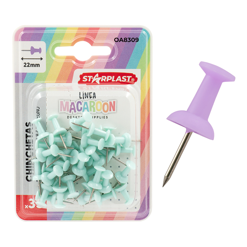 Chinchetas con tirador de colores pastel: rosa, verde y lila.