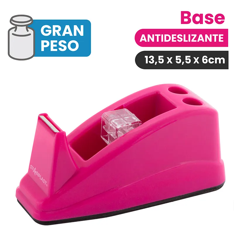 Dispensador de cinta con base antideslizante y portalápiz.