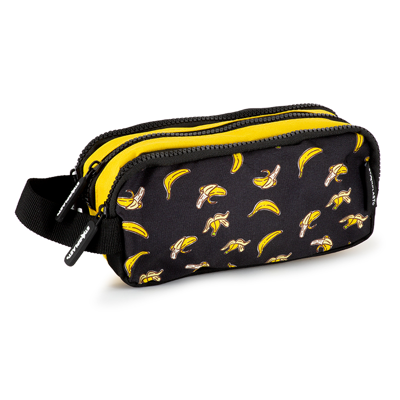 Estuche escolar rectangular de tela con 3 compartimentos y 3 cremalleras y asa.