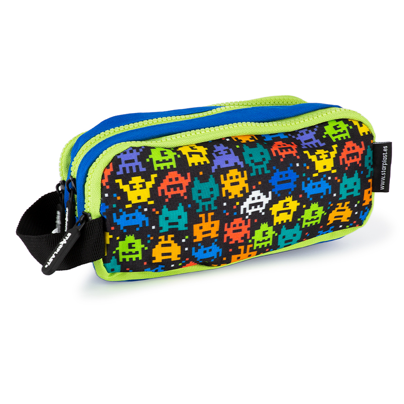 Estuche escolar rectangular de tela con 3 compartimentos y 3 cremalleras y asa.