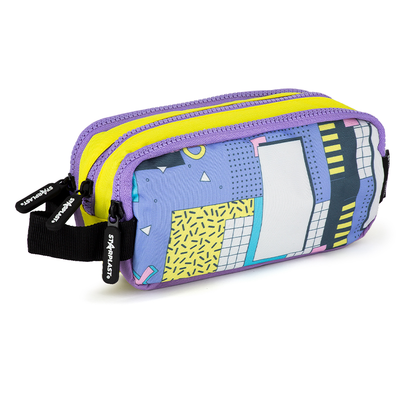 Estuche escolar rectangular de tela con 3 compartimentos y 3 cremalleras y asa.