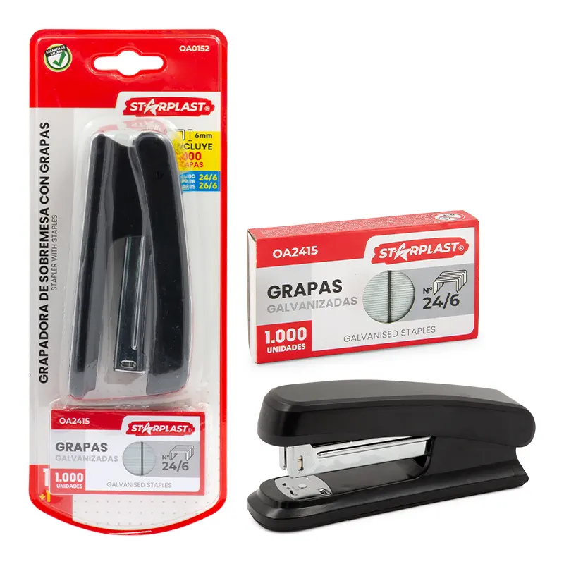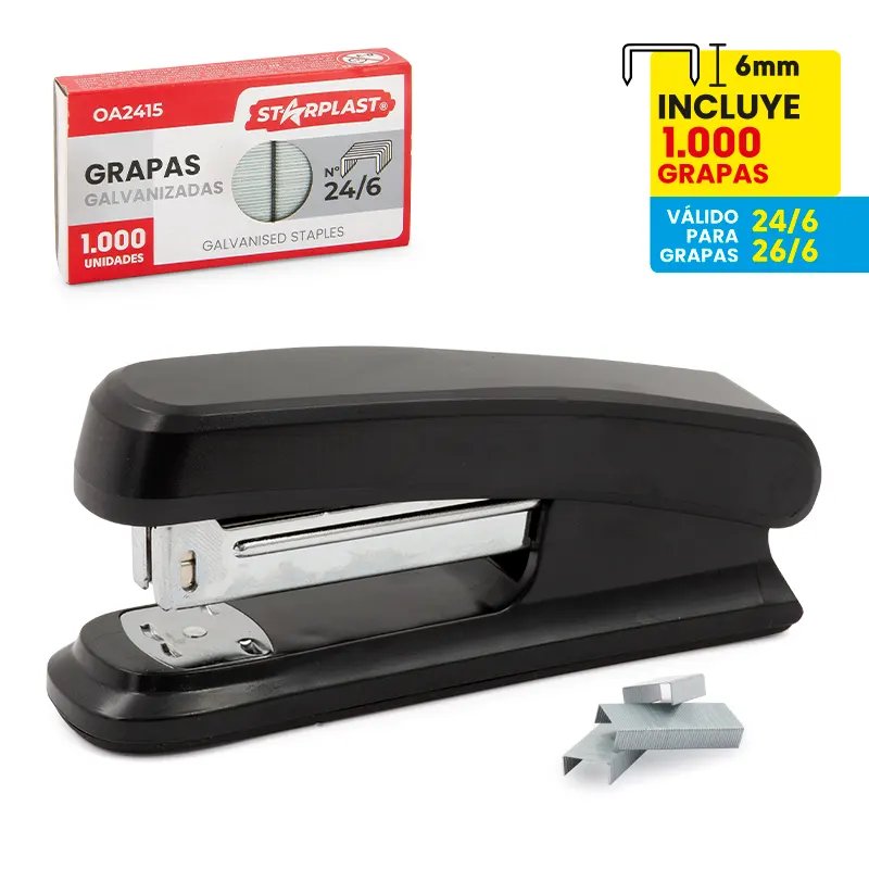 Grapadora de sobremesa en color negro para oficina.