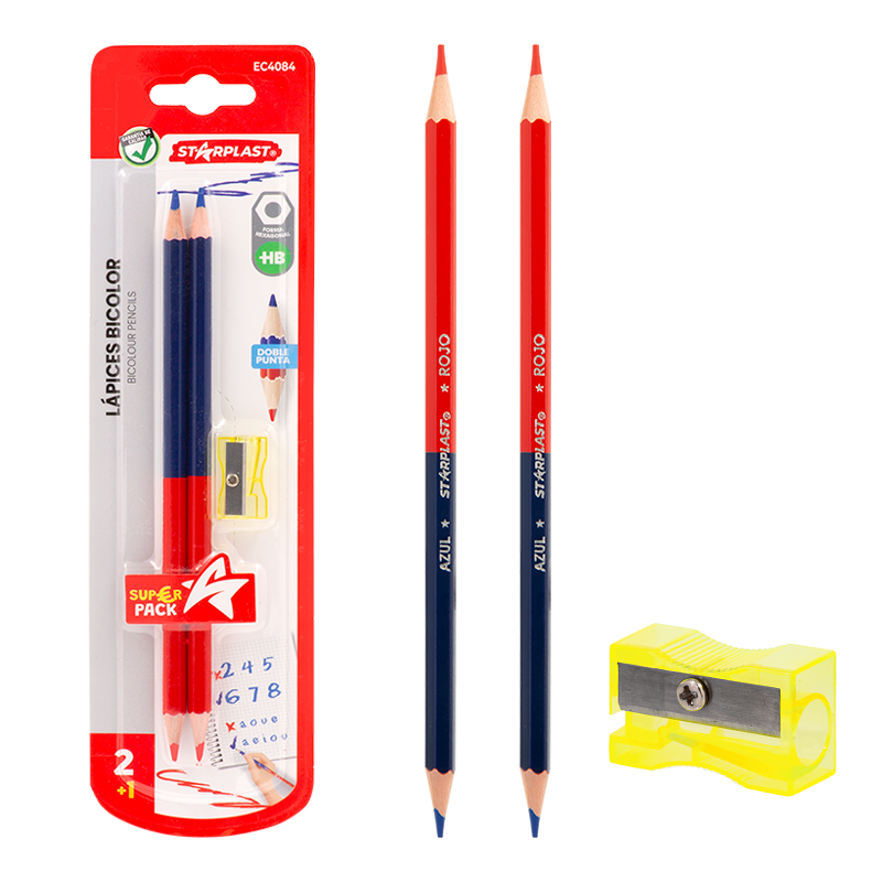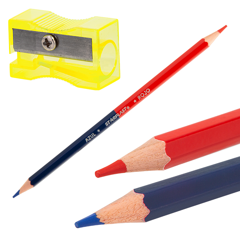 Lápices bicolor azul y rojo. Cuerpo hexagonal.