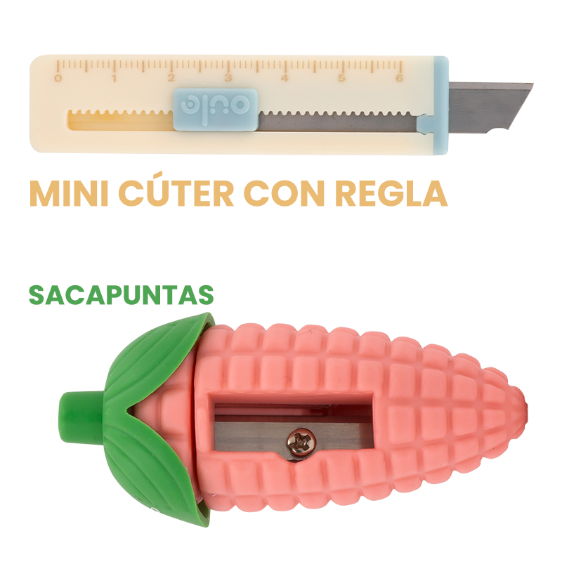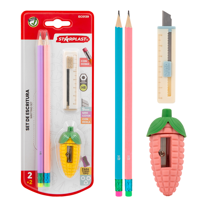 El pack contiene 2 lápices HB, un sacapuntas y un mini cúter.
